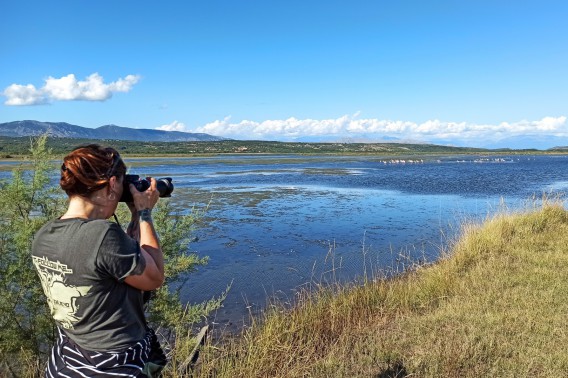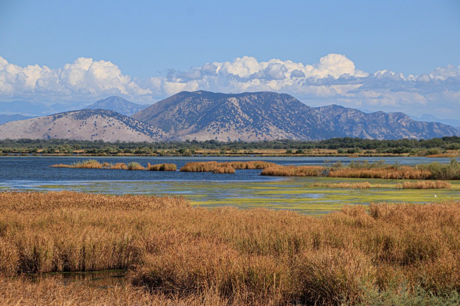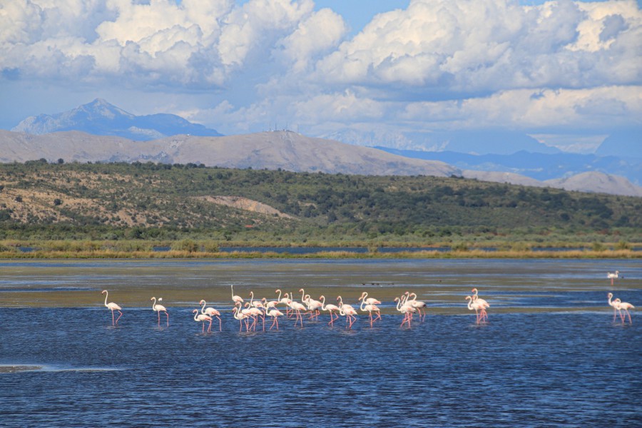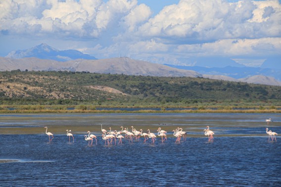 Flamingos, Pelikane, Löffler und unzählige andere Vögel erfreuen selbst ein Nicht-Ornithologen-Herz und am anderen Ende der schillernden Wasserebene erheben sich die Berge Albaniens.