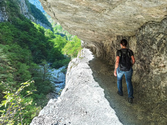Je weiter wir in die Schlucht vorstoßen, desto spektakulärer wird sie. Die Felswände, die teilweise mehrere hundert Meter hoch sind, kommen einander immer näher und scheinen förmlich gen Himmel zu schießen. Auf der spektakulärsten Etappe wurde der Pfad als Galerie, also als ein zum Abgrund offener Gang in die steil zum Fluss abfallende senkrechte Wand geschlagen. Das ist nichts für zarte, zum Schwindel neigende Gemüter!