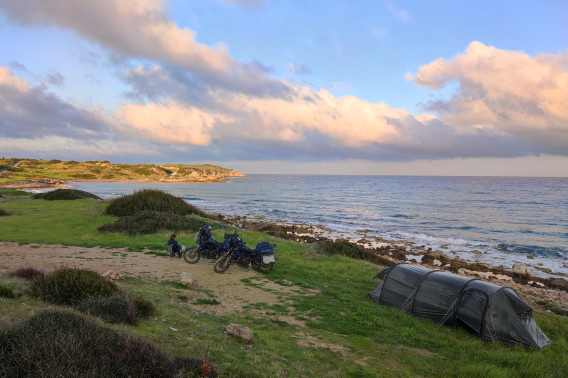 Nur wenige Minuten dauert die Einreise in die "Türkischen Republik Nordzypern", die außer der Türkei kein einziges Land der Welt als Staat anerkannt hat. Direkt an der Küste, inmitten von alten Kasernen-Ruinen, finden wir ein liebliches Fleckchen Wiese, auf dem wir unser Zelt mit Logenblick aufs Meer aufstellen.