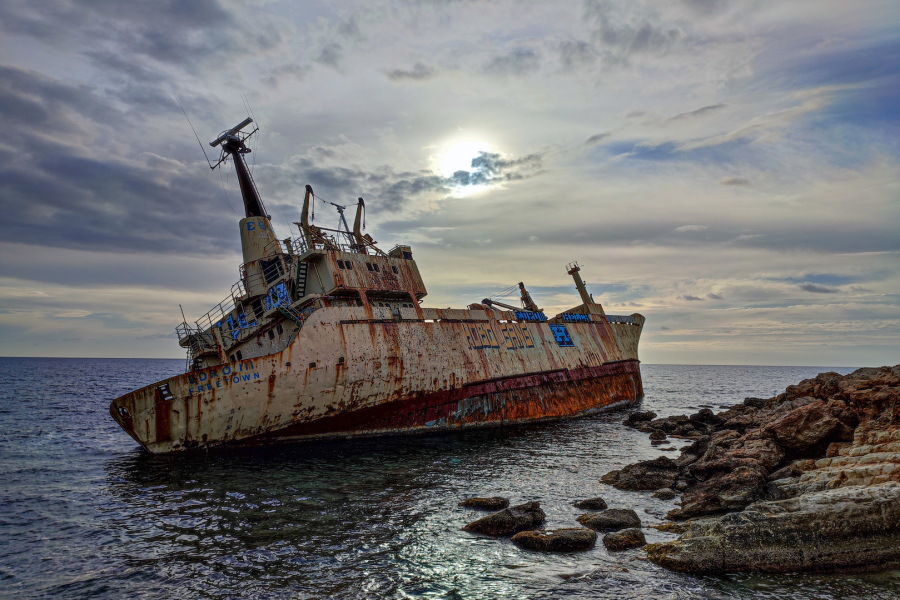 Rosa schimmernde Flamingos schauen von einem Salzsee zu uns herüber. Die Asphaltstraße wird zur schlaglöchrigen Erdpiste und später auf rund einem Kilometer Länge ist es nur noch eine durch Pylone notdürftig markierte Spur im überraschend festen Sand, auf dem es sich leicht fährt. Kurz darauf verleitet uns die Burg von Kolossi zu einem kurzen Stopp, bevor wir bei angenehmen 20 Grad unsere Tour fortsetzen. Nur einige hundert Meter weit draußen im ruhigen Mittelmeer rostet das Wrack der MV Demetrios II fotogen vor sich hin. Leider zieht sich, gerade als wir in Fotoschussweite sind, der Himmel zu. Also weiter zum nächsten havarierten Schiff, dem Wrack der Erdo III, das uns dicht an der Küste liegend und im milden Licht der tief stehenden Sonne in seinen Bann zieht.