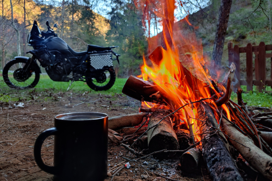Und so sind wir schnell wieder in Richtung wärmerer Niederungen unterwegs, wo wir in einem Pinienwald wenig später unser Lager aufschlagen und uns ein einfaches, aber leckeres Abendessen auf unserem Benzinkocher brutzeln. Mit Einbruch der Dunkelheit wird es flott frisch, was uns am romantisch knisternden Lagerfeuer jedoch nicht wirklich juckt.