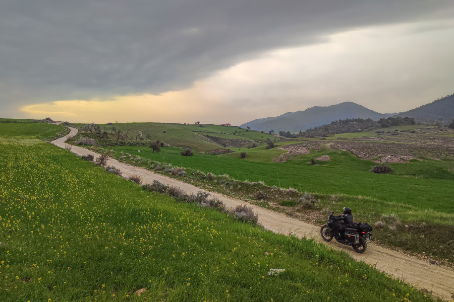 Die eigentliche Attraktion für uns sind jedoch die endlos gewundenen kleinen Asphaltsträßchen und Pisten, die uns in einen Kurvenrausch versetzen und ein fettes Grinsen ins Gesicht zaubern. Da macht es auch nichts, dass der Himmel wolkenverhangen ist.